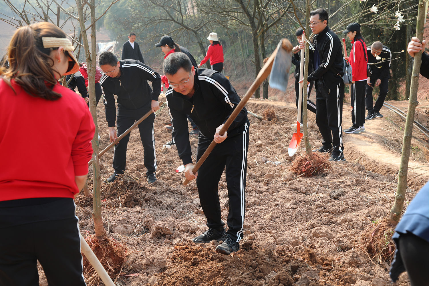 隨后,大家積極主動的投入到植樹活動中,通過挖坑鏟土、扶樹正苗、踩土定植、澆水灌溉,有條不紊地開展每道種植工序。