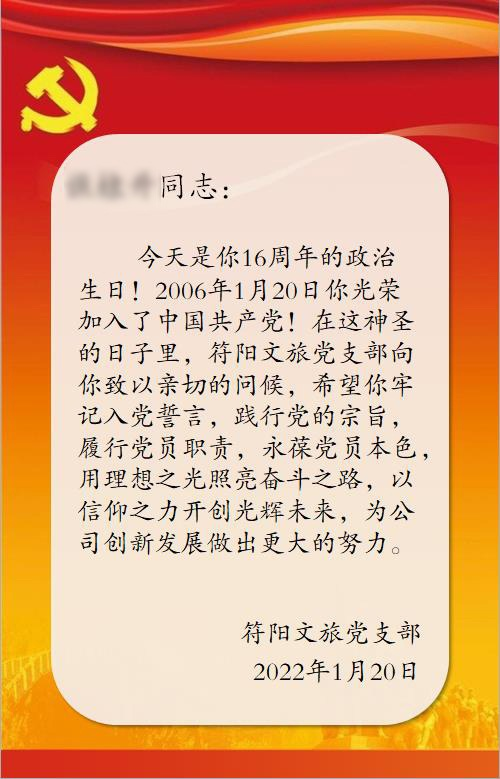 支部在核準(zhǔn)每一名黨員入黨時(shí)間的基礎(chǔ)上,按照黨員入黨日期建立黨員“政治生日”臺(tái)賬,每逢黨員“政治生日”當(dāng)天,黨支部將在黨員微信群發(fā)一張電子賀卡,讓黨員充分感受到組織的關(guān)懷與溫暖,從而將思想認(rèn)同轉(zhuǎn)化為牢記初心、堅(jiān)定信仰的前進(jìn)動(dòng)力,努力為公司的創(chuàng)新發(fā)展做出更大貢獻(xiàn)!