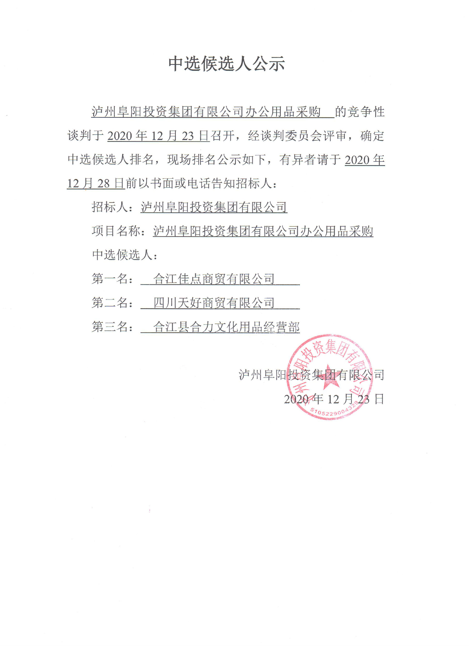 瀘州阜陽(yáng)投資集團(tuán)有限公司辦公用品采購(gòu)中選候選人公示