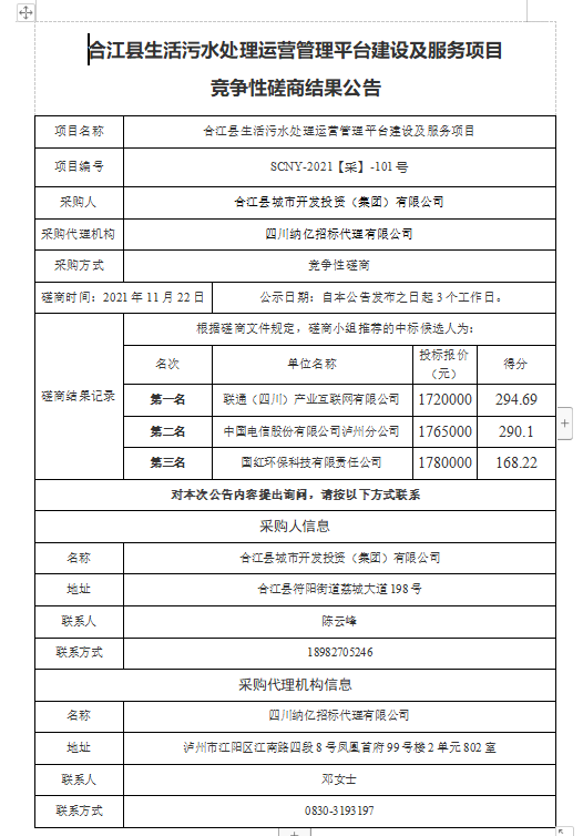合江縣生活污水處理運(yùn)營管理平臺建設(shè)及服務(wù)項目競爭性磋商結(jié)果公告