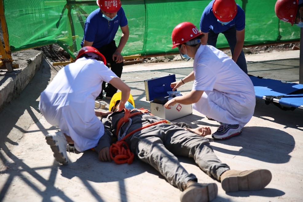 演練活動模擬施工工人從高處墜落,項目部接到通報后立即啟動應(yīng)急救援預(yù)案,“安全事故”最終得到圓滿處置。應(yīng)急救援演練后,醫(yī)護(hù)人員講解了心肺復(fù)蘇、開放性外傷包扎等應(yīng)急救援醫(yī)護(hù)方法。