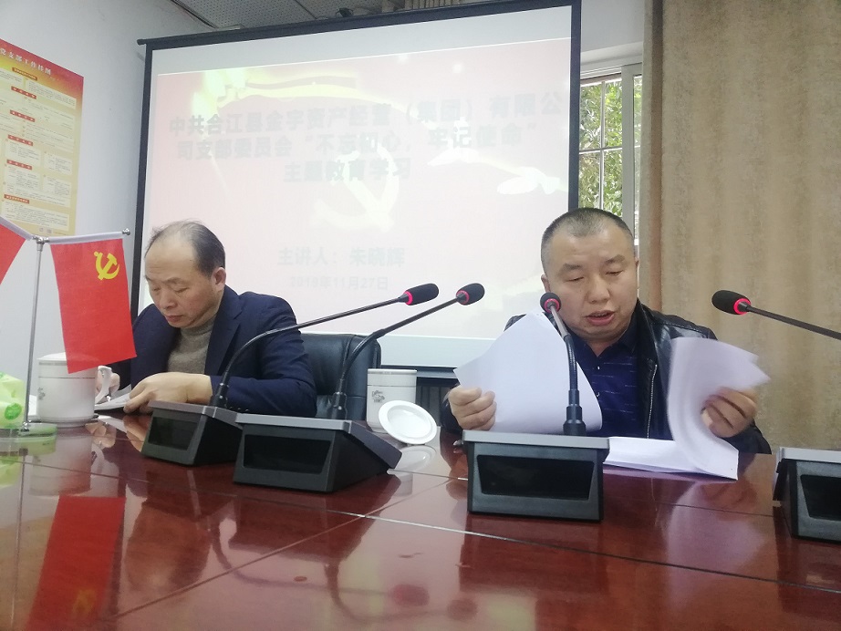 2019年11月27日合江縣金宇資產(chǎn)經(jīng)營(集團)有限公司組織“不忘初心、牢記使命”主題教育學習,朱曉輝總經(jīng)理在會上要求員工時刻牢記“講政治、講忠誠”“守紀律、講規(guī)矩”,樹牢紅線意識;指出主題教育學習在時間安排上雖然接近尾聲,但是時刻不能松懈,要持續(xù)增強“四個意識”、堅定“四個自信”、做到“兩個維護”,為新時代發(fā)展站好崗、履好職。