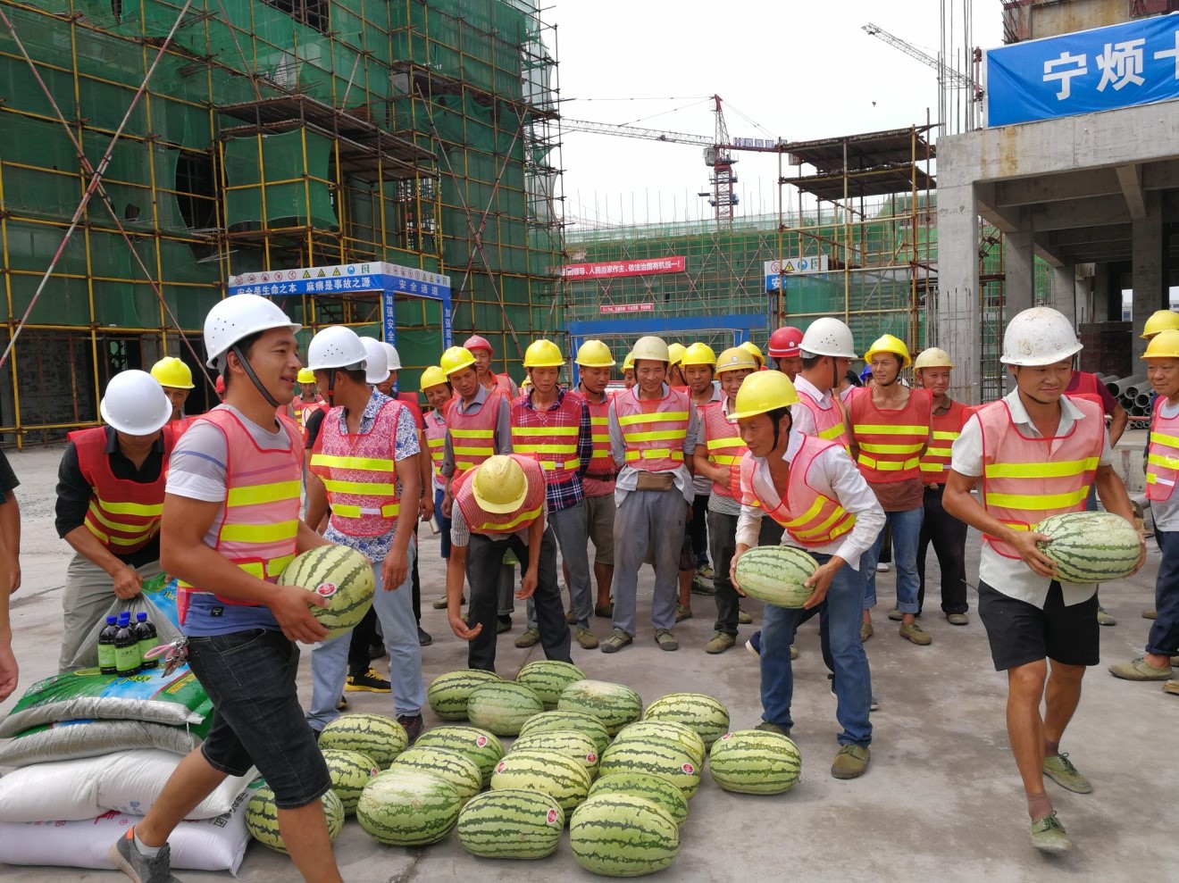 2019年8月5日下午,縣總工會會同城投公司、鑫晟公司、廣源達(dá)公司到鑫晟學(xué)府項目開展送“清涼”活動??h工會領(lǐng)導(dǎo)一行對建筑工人表示慰問,并為他們送上藿香正氣液、風(fēng)油精、西瓜、綠豆、白糖等降暑防暑物品。