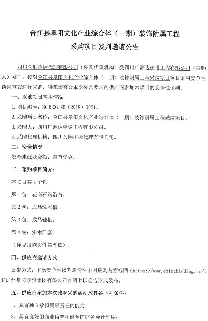 合江縣阜陽(yáng)文化產(chǎn)業(yè)綜合體(一期)裝飾附屬工程采購(gòu)項(xiàng)目談判邀請(qǐng)公告.doc