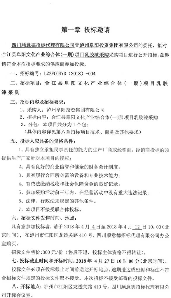 投標邀請:合江縣阜陽文化產業(yè)綜合體(一期)項目乳膠漆采購