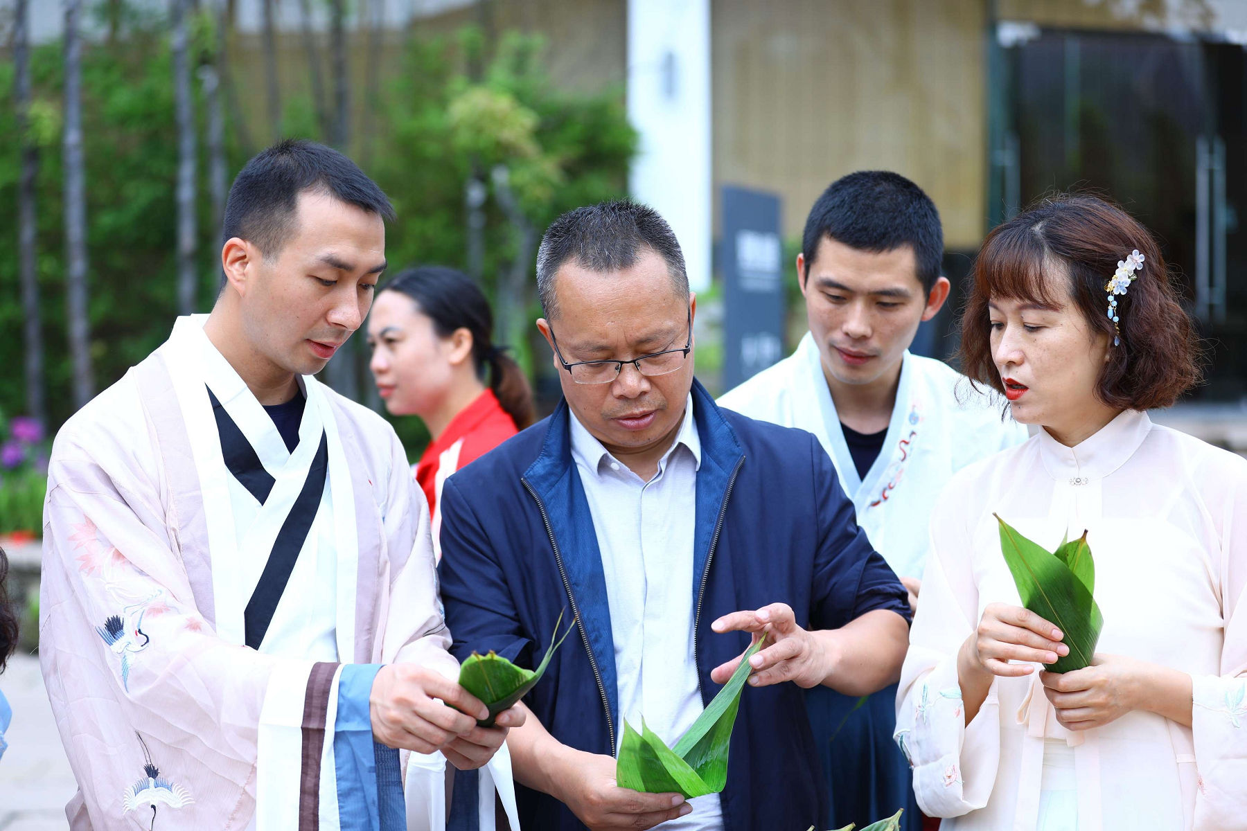 龍掛山景區(qū)是阜陽集團下屬符陽文旅公司打造的的文 化休閑度假旅游目的地, 景區(qū)云霧如海, 美景如畫, 建筑獨 具傳統(tǒng)川南民宿特色。 活動中, 阜陽集團員工身著漢服, 人 與自然情景交融、交相輝映,仿若穿越到了“狗吠深巷中、 雞鳴桑樹顛”的古代美好田園生活。在見禧 . 山語的院子里, 大家圍成一圈, 開展包粽子比賽。 員工們踴躍參加、 興致高 漲, 集團總經(jīng)理任東財和員工們一起動手, 互相學習、 邊學 邊包、 比拼手藝, 包出了三角形、 長方形、 圓錐形等形態(tài)各 異的粽子,現(xiàn)場洋溢著歡樂的節(jié)日氣氛。